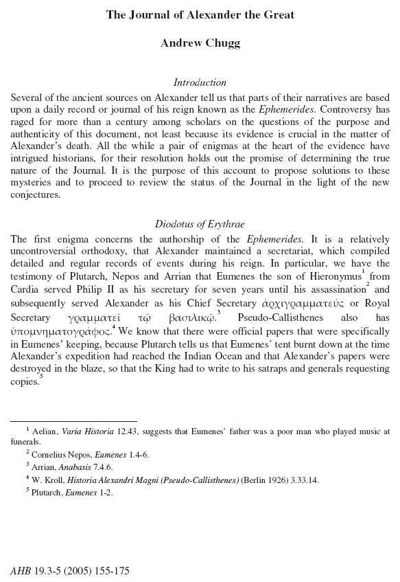 An article on The Journal of Alexander the Great by Andrew Chugg is scheduled to be published in the Ancient History Bulletin, Issue 19.3-5 in November or December 2006. It shows that the surviving fragments of Alexander�s Royal Journal are very probably authentic. This means that the King is likely to have died of a fever, rather than through poisoning. This issue of the Ancient History Bulletin can be ordered for $15 from its website at http://www.uwinnipeg.ca/faculty/classics/ahb.html This article was the subject of a newspaper story in the Independent in 2005, which can be found here: http://news.independent.co.uk/world/science_technology/article304278.ece |